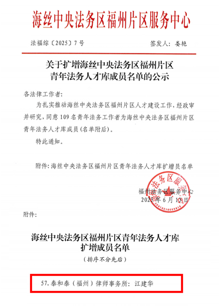 泰和泰福州律師事務所律師入選福建省涉外法律咨詢顧問團、海絲中央法務區(qū)福州片區(qū)青年法務人才庫 福州律師資訊發(fā)布者 福州律師網2025年6月20日福建省涉外法律咨詢顧問團 近日,省司法廳和省律師協會共同成立“福建省涉外法律咨詢顧問團”,集合了全省100余名優(yōu)秀涉外律詳情