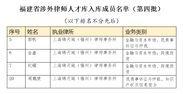 錦天城福州分所律師成功入選福建省涉外律師人才庫 福州律師資訊發(fā)布者 福州律師網(wǎng)2024年8月12日日前,福建省司法廳辦公室公布了“福建省涉外律師人才庫入選成員名單(第四批)”,確定62名律師入選福建省涉外律師人才庫。上詳情