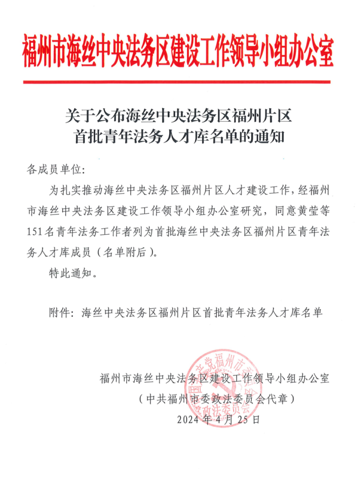 福州律師資訊:海絲中央法務區(qū)福州片區(qū)首批青年法務人才庫名單正式發(fā)布! 福州律師資訊發(fā)布者 福州律師網(wǎng)2024年4月28日為扎實推動海絲中央法務區(qū)福州片區(qū)人才建設工作,經(jīng)福州市海絲中央法務區(qū)建設工作領導小組辦公室研究,同意黃瑩等151名青年法詳情