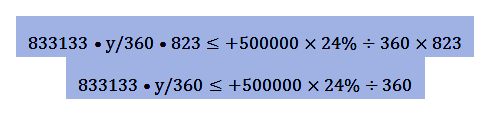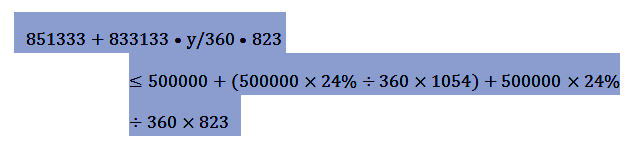 前面已經(jīng)計(jì)算過,(500000×24%÷360×1054)就是前期利息上限351333元,加上前期本金50萬元,就等于前期本息之和上限851333元。所以經(jīng)過計(jì)算,方程簡化為: