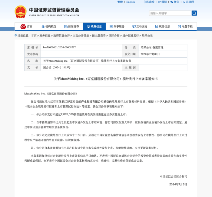 大成福州律師事務(wù)所助力好定多集團完成境外上市證監(jiān)會備案 福州律師資訊發(fā)布者 福州律師網(wǎng)2024年7月19日2024年7月8日,中國證監(jiān)會國際合作司發(fā)布關(guān)于MaxsMaking Inc.(邁克麗斯股份有限公司)境外發(fā)行上市備案通詳情