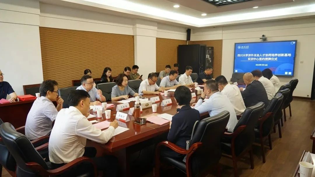 2024年7月16日上午,四川大學(xué)涉外法治人才協(xié)同培養(yǎng)創(chuàng)新基地實(shí)訓(xùn)中心簽約授牌儀式在四川大學(xué)望江校區(qū)明德樓舉行。四川大學(xué)副校長(zhǎng)游勁松出席儀式并見(jiàn)證簽約;四川省司法廳律師工作處副處長(zhǎng)況玥、四川省律師協(xié)會(huì)及實(shí)訓(xùn)中心依托建設(shè)單位代表,學(xué)校相關(guān)部處和法學(xué)院負(fù)責(zé)人參加簽約授牌儀式。儀式由法學(xué)院副院長(zhǎng)劉昕杰主持。