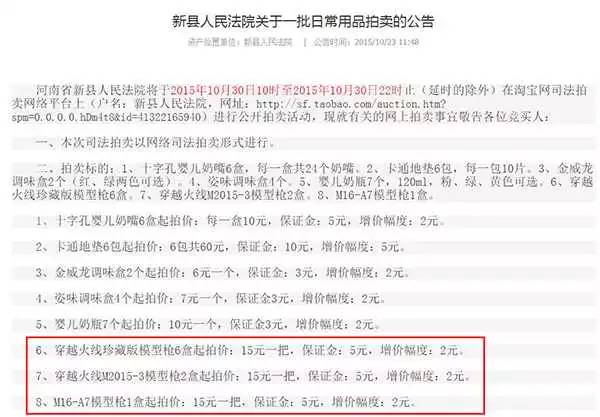新縣法院發(fā)布的競(jìng)買公告顯示,這些玩具槍除了“CYMA-P.661B模型槍”的起拍價(jià)為30元一支,其余的玩具槍起拍價(jià)均為15元一支。目前,上述兩場(chǎng)拍賣均已結(jié)束,成交價(jià)最高的為一支“穿越火線M2015-3模型槍”,該標(biāo)的物起拍價(jià)位15元,最終以205元成交。