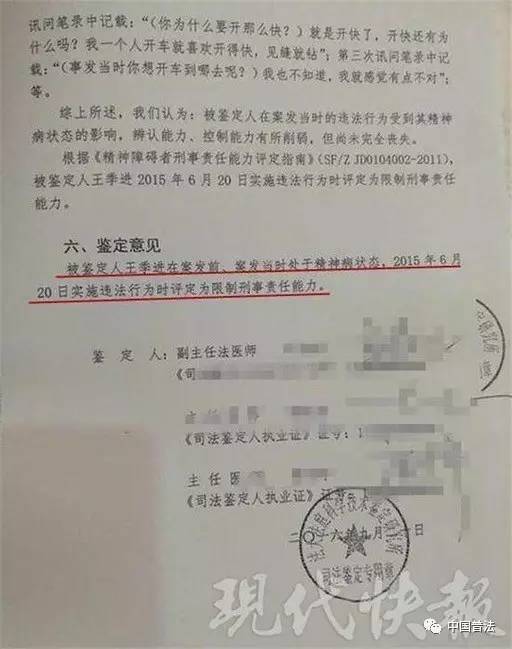 該報告最終的鑒定意見為:王季進在案發(fā)前、案發(fā)當時處于精神病狀態(tài),被鑒定人王季進2015年6月20日實施違法行為時評定為限制刑事責任能力。