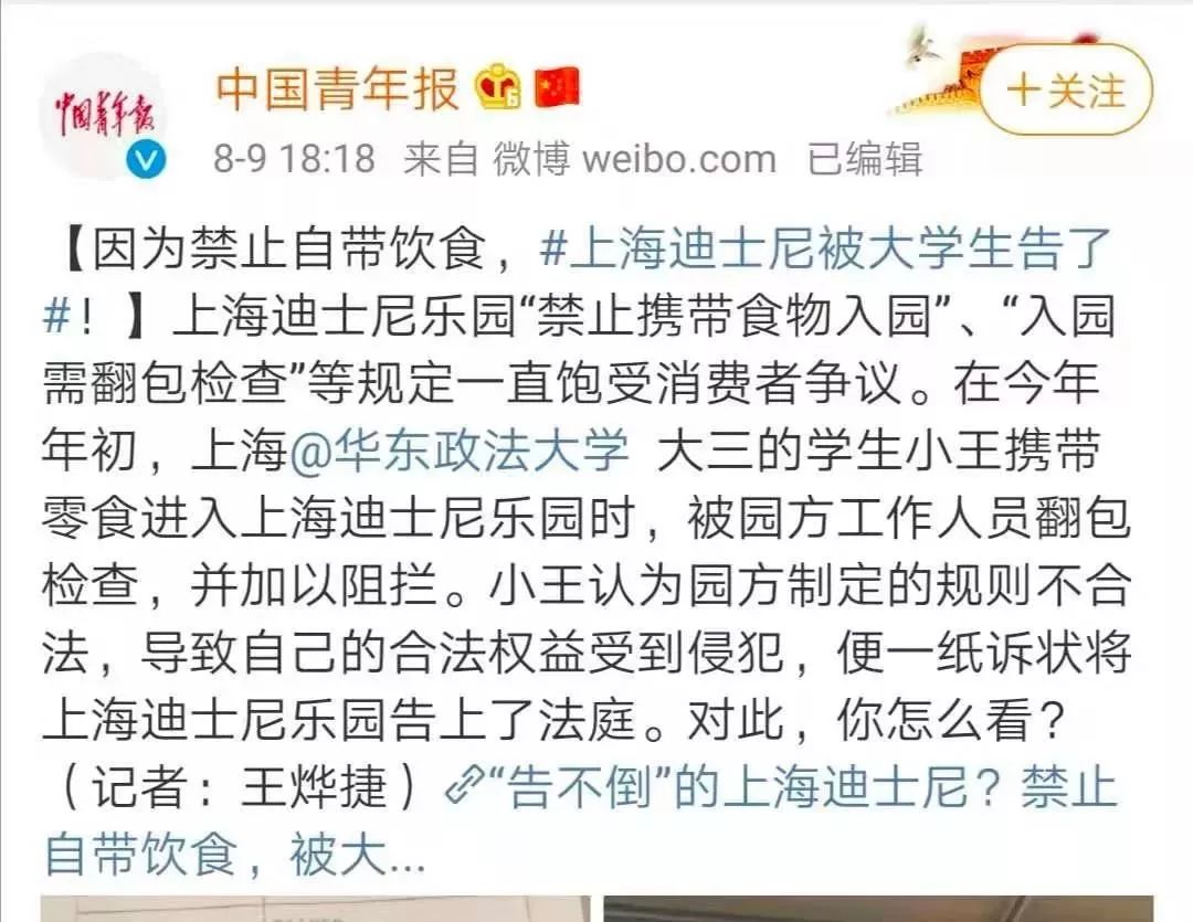 但從2017年11月15日起,上海迪士尼對(duì)入園游覽的游客須知進(jìn)行了調(diào)整,規(guī)定“不得攜帶以下物品入園:食品;酒精飲料;超過(guò)600毫升的非酒精飲料”,這與過(guò)去允許攜帶原始包裝、密封的、未開(kāi)封的及不需任何加工或處理即可享用的食品相去甚遠(yuǎn)。