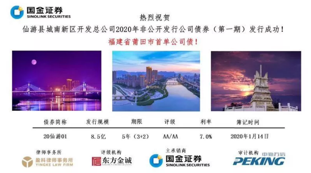 1 月 17 日,盈科福州律師助力仙游縣城南新區(qū)開發(fā)總公司2020年非公開發(fā)行公司債券(第一期)掛牌成功。