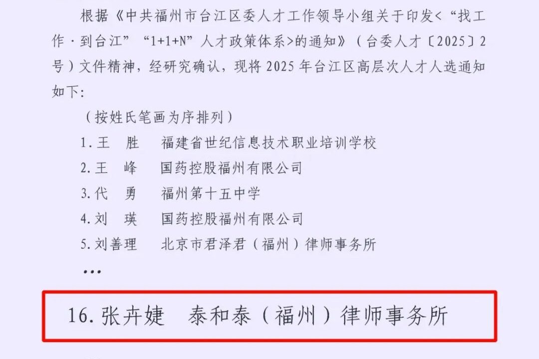 泰和泰福州律師事務(wù)所張卉婕律師獲2025年臺江區(qū)高層次人才認(rèn)定 福州律師資訊發(fā)布者 福州律師網(wǎng)2025年10月13日近日,中共福州市臺江區(qū)委人才工作領(lǐng)導(dǎo)小組辦公室發(fā)出《關(guān)于確認(rèn)2025年臺江區(qū)高層次人才的通知》,公布了2025年臺江區(qū)高詳情