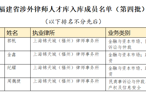 錦天城福州分所律師成功入選福建省涉外律師人才庫 福州律師資訊發(fā)布者 福州律師網(wǎng)2024年8月12日日前,福建省司法廳辦公室公布了“福建省涉外律師人才庫入選成員名單(第四批)”,確定62名律師入選福建省涉外律師人才庫。上詳情