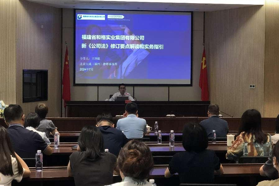 大成福州律師受邀為和格實(shí)業(yè)集團(tuán)開(kāi)展新《公司法》要點(diǎn)解讀和實(shí)務(wù)指引講座 福州律師資訊發(fā)布者 福州律師網(wǎng)2024年7月24日近日,大成福州合伙人王澤聰律師受邀為福建省和格實(shí)業(yè)集團(tuán)有限公司(以下簡(jiǎn)稱和格實(shí)業(yè)集團(tuán))開(kāi)展《新<公司法>修訂詳情