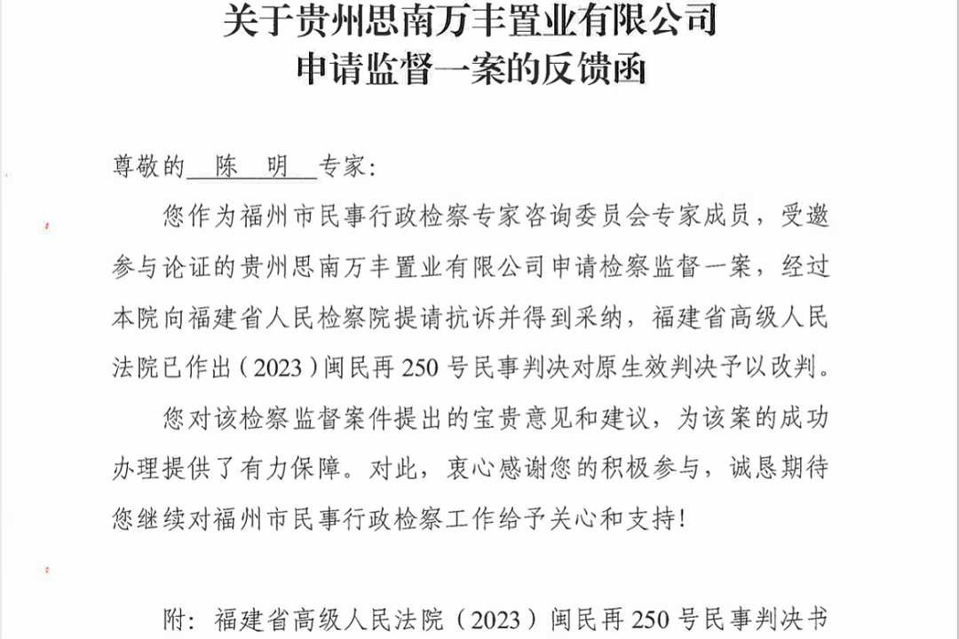 福州律師資訊: 福州市人民檢察院向錦天城·福州發(fā)來(lái)案件感謝反饋函 福州律師資訊發(fā)布者 福州律師網(wǎng)2023年9月20日近日,上海錦天城(福州)律師事務(wù)所收到福州市人民檢察院發(fā)來(lái)的《有關(guān)貴州思南萬(wàn)豐置業(yè)有限公司申請(qǐng)監(jiān)督一案的反饋函》,對(duì)錦天詳情